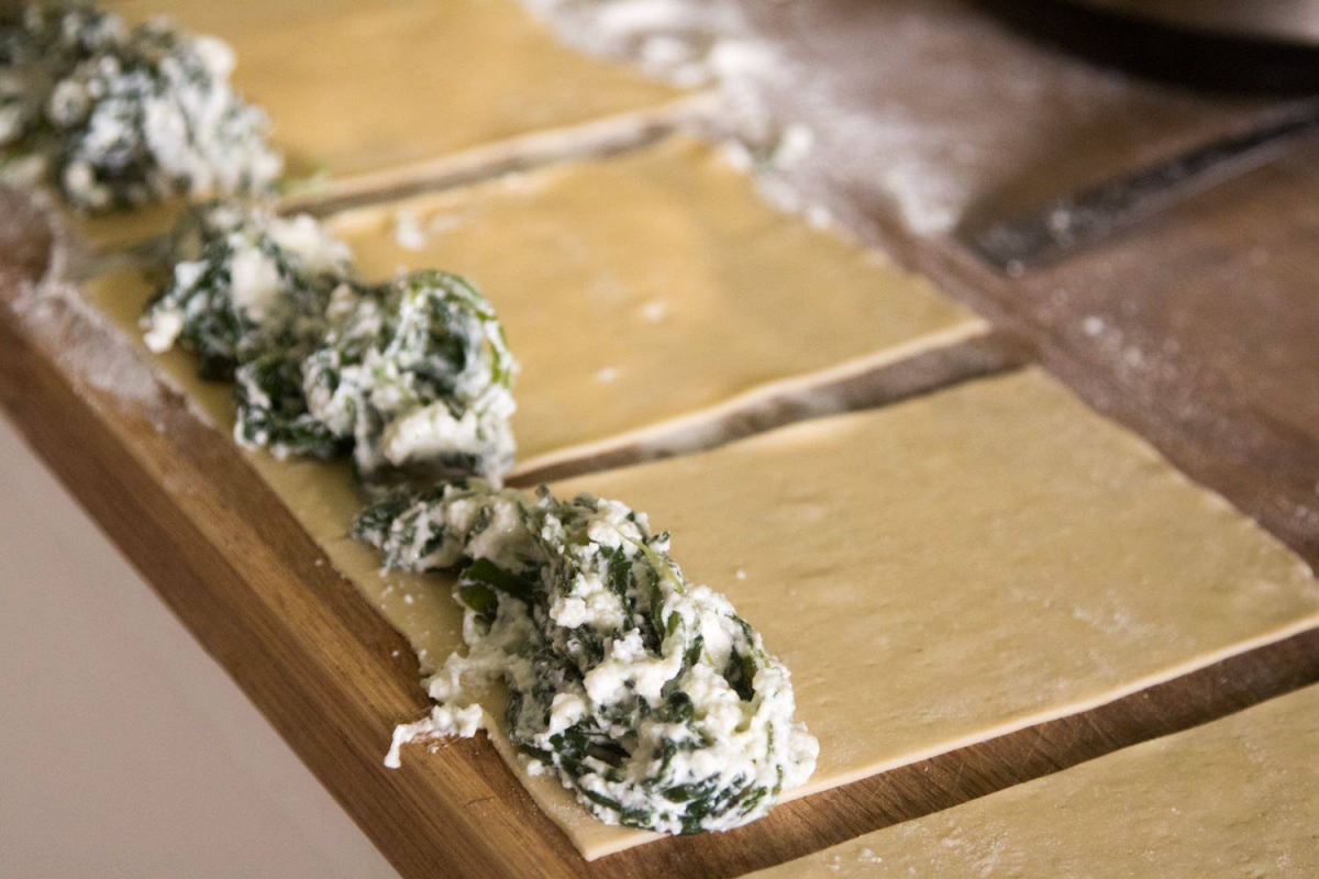 2. במחבת עם 2 כפות שמן זית או 20 גר’ חמאה נקפיץ את התרד עם הבצל והשום הכתוש עד כניעה. נקרר נחתוך בסכין ונוסיף לתרד: ריקוטה, גרידת לימון 2 כפות פרמז’ן וחלמון, מלח ופלפל. נערבב היטב ונשים במקרר.