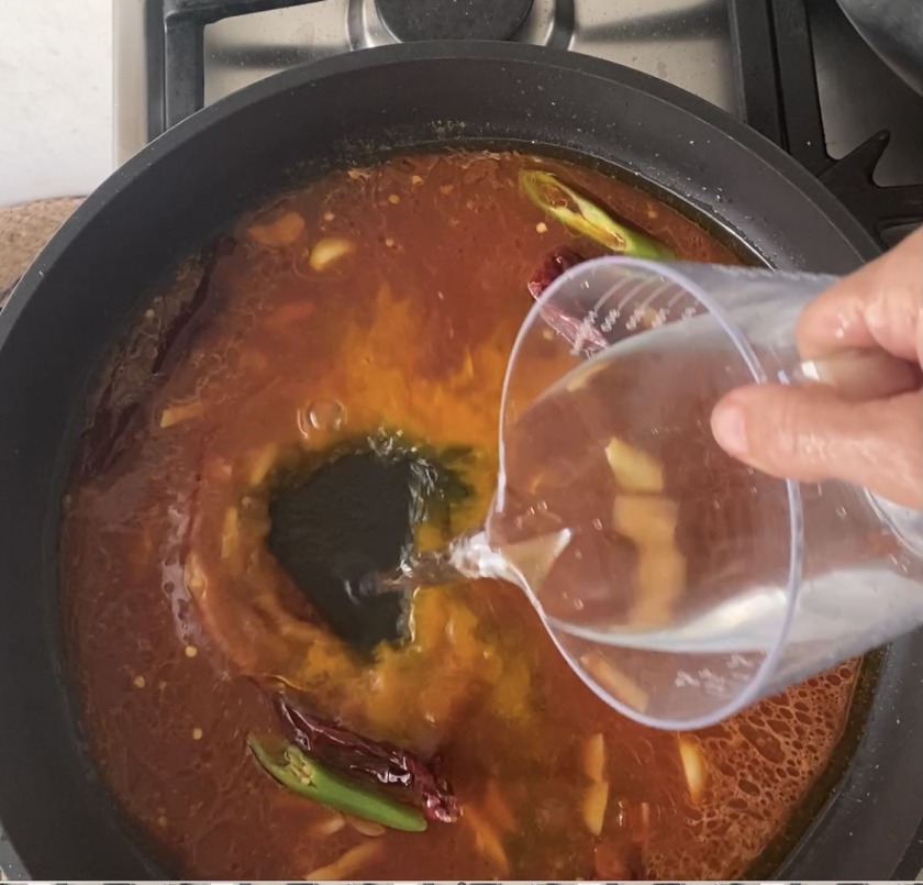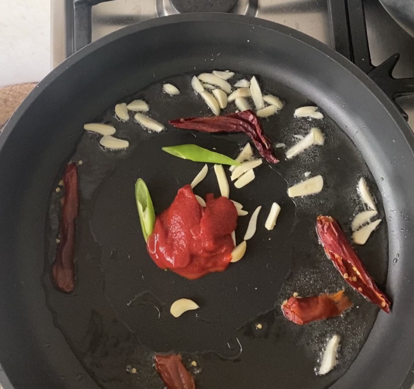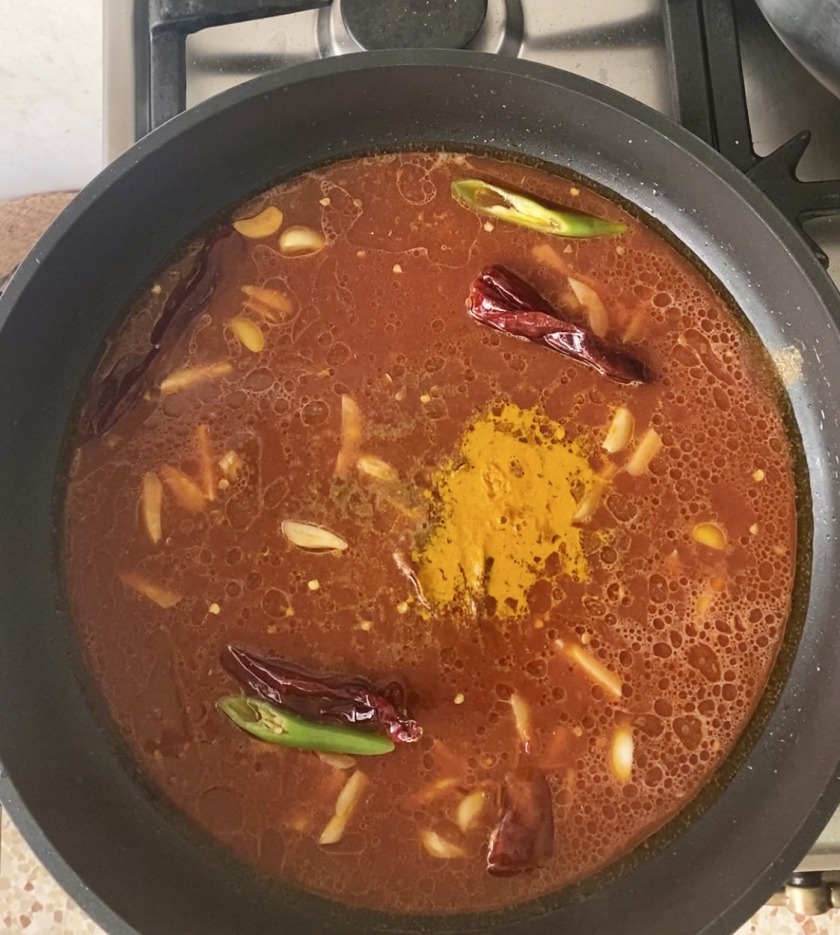 2. הרוטב: לסיר רחב ושטוח עם רבע כוס שמן זית נוסיף שיני שום, פלפל ירוק חריף ופלפל אדום יבש ורק אז נדליק כיריים, כשמתחילים להריח את השום, נוסיף כף רסק, פפריקה, מלח, כורכום ומים. נערבב היטב, נביא לרתיחה, נכסה וננמיך אש קטנה