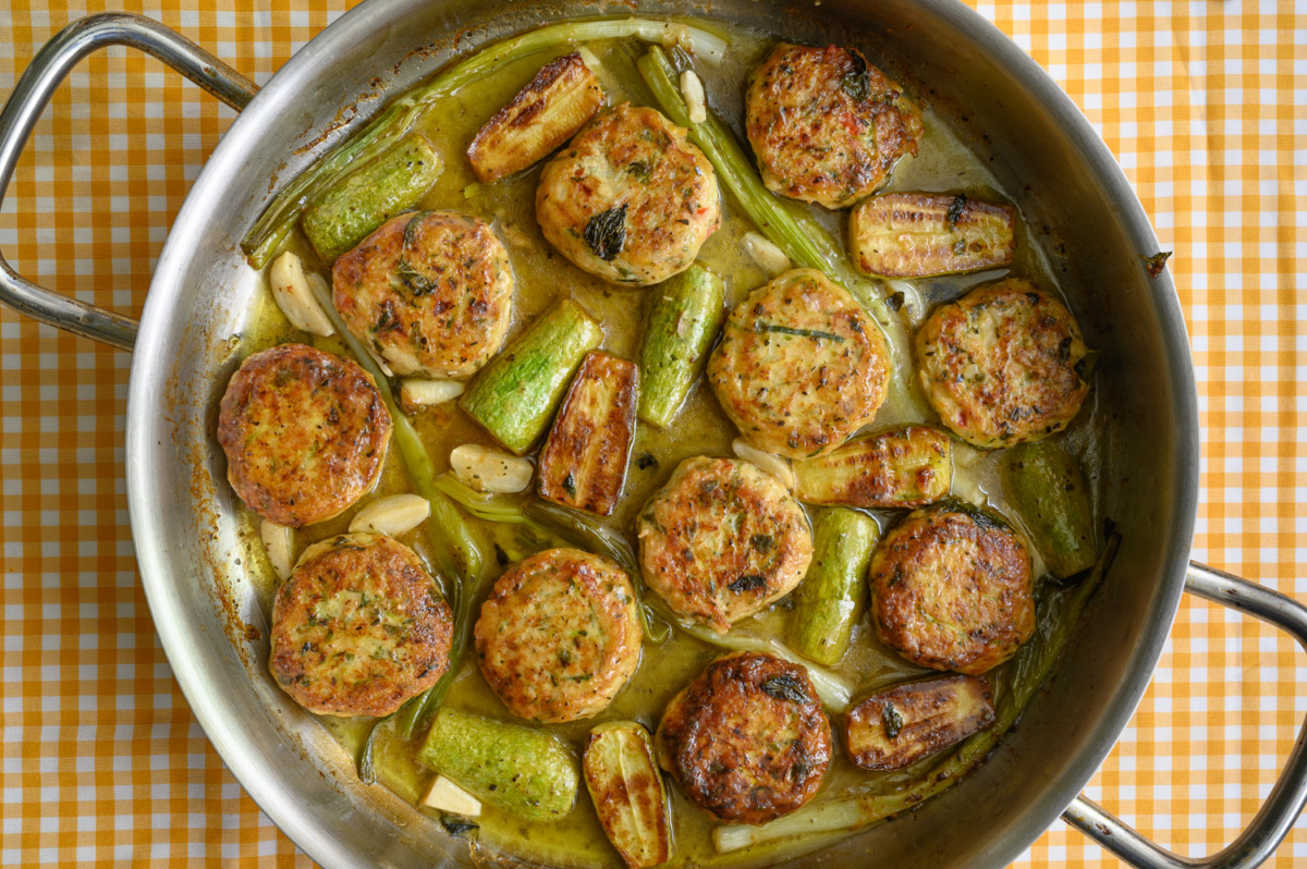 במחבת נון סטיק על להבה גבוהה נטגן קלות הקציציות, נהפוך אותן צד אחרי השחמה כ 3-4 דק, נשבץ קישואים ובצל ירוק ניצוק הרוטב, ננמיך אש ונכסה סיר 20 דק. נעטר בנענע קצוצה.