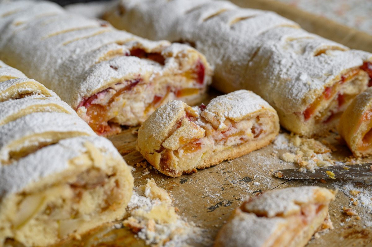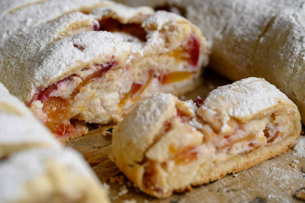 הבצק עשיר, כייפי לרידוד וגלגול, פריך (ולא מתוק) עם פרי העונה-  בחורף: תותים, תפוחים או אגסים. בקיץ: שזיפים/משמשים/אפרסקים