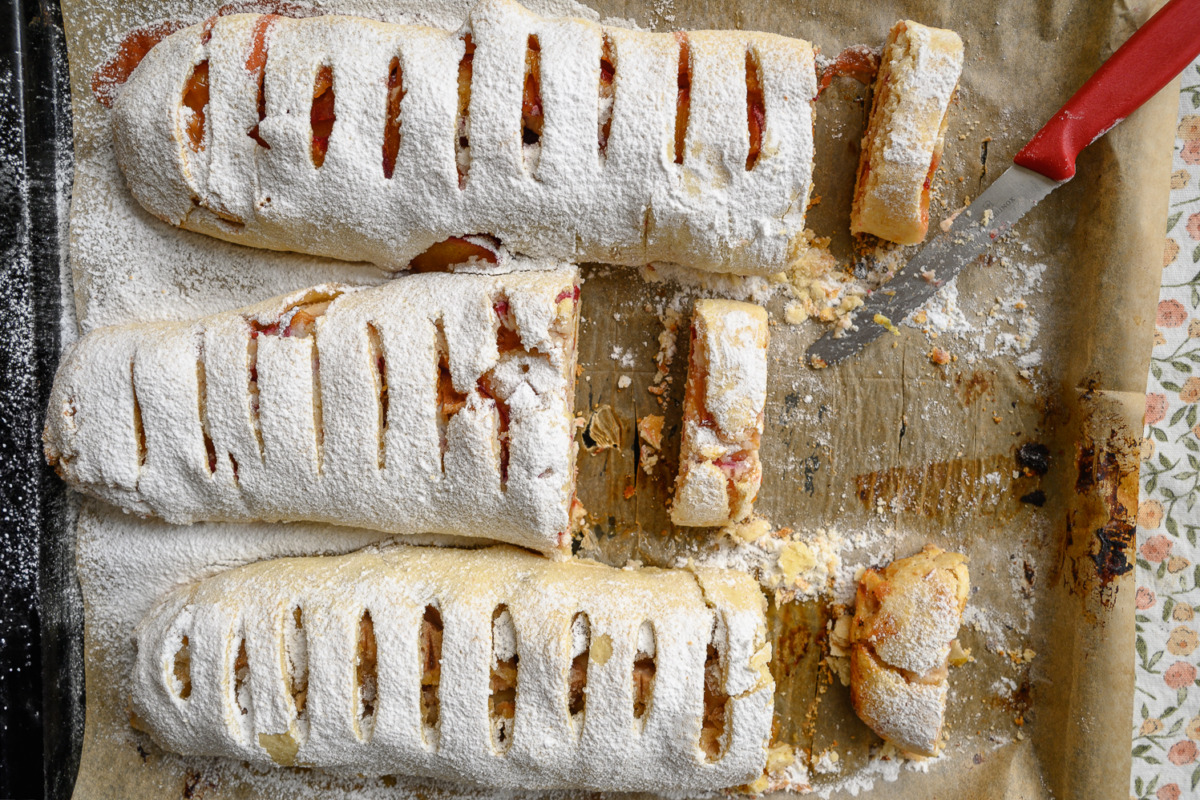 הבצק עשיר, כייפי לרידוד וגלגול, פריך (ולא מתוק) עם פרי העונה-  בחורף: תותים, תפוחים או אגסים. בקיץ: שזיפים/משמשים/אפרסקים