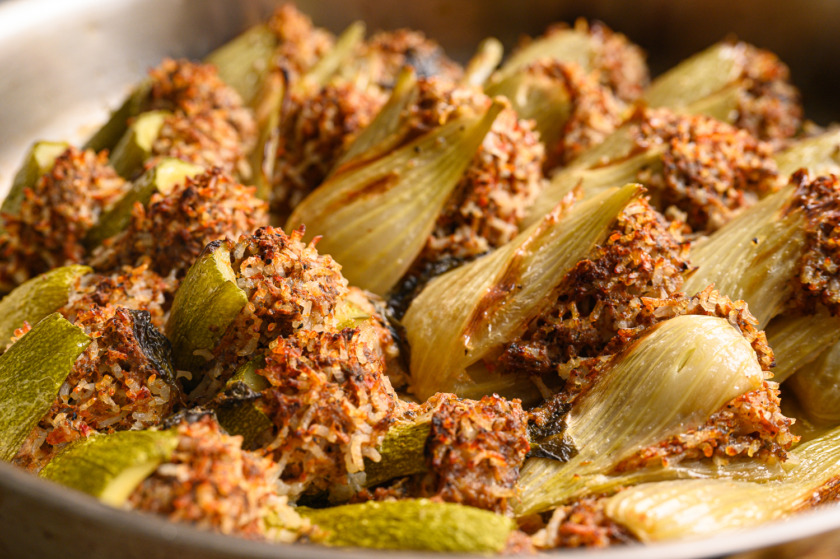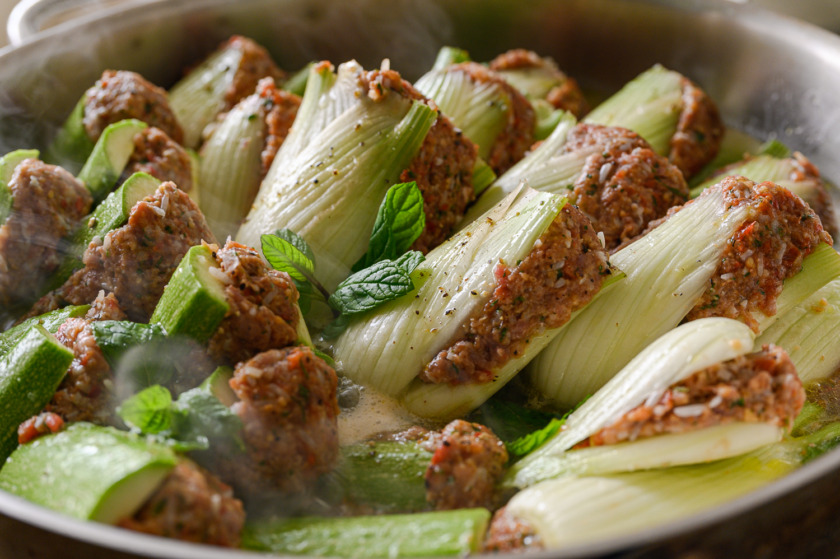 הקישואים: נחתוך את הצדדים, נחתוך קישוא לשניים וכל חצי קישוא נחצה כמו סנדביץ’ לא עד הסוף. נמלא בנדיבות.