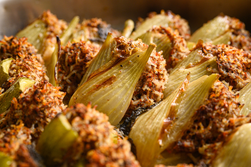 השומרים: נוריד את גדילי השומר, נחצה השומר לחצי וכל חצי נחתוך מהצד של הגדילים לא של הגזע, לא עד הסוף (נקבל “לוע”). נמלא בקציצת מילוי – בנדיבות נמלא. ככה נעשה עם כולם.