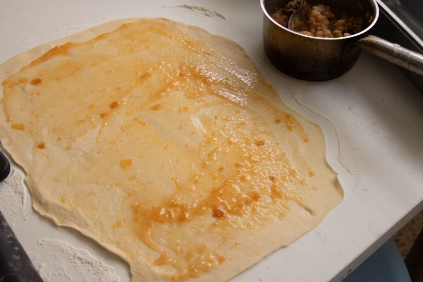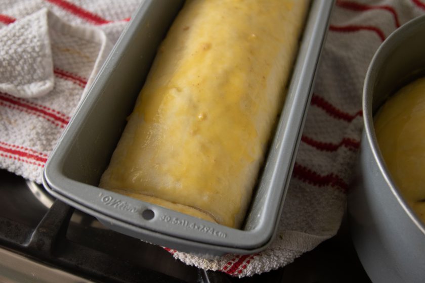 4. נגלגל איך שרוצים, נכין גם את כדור הבצק השני, נעביר לתבנית משומנת ונניח לו לתפוח עוד שעה, נכסה התבנית במגבת או ניילון נצמד.