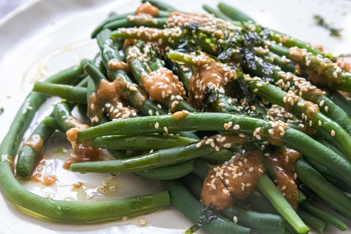 - נפזר מעל השעועית, נפדר בשומשום וקרעי אצות, נערבב עם הידיים. טעימי.
