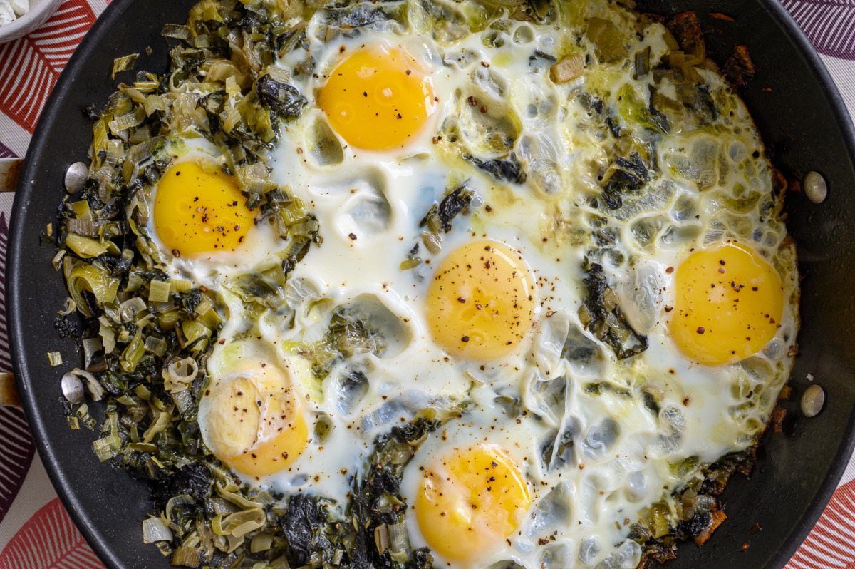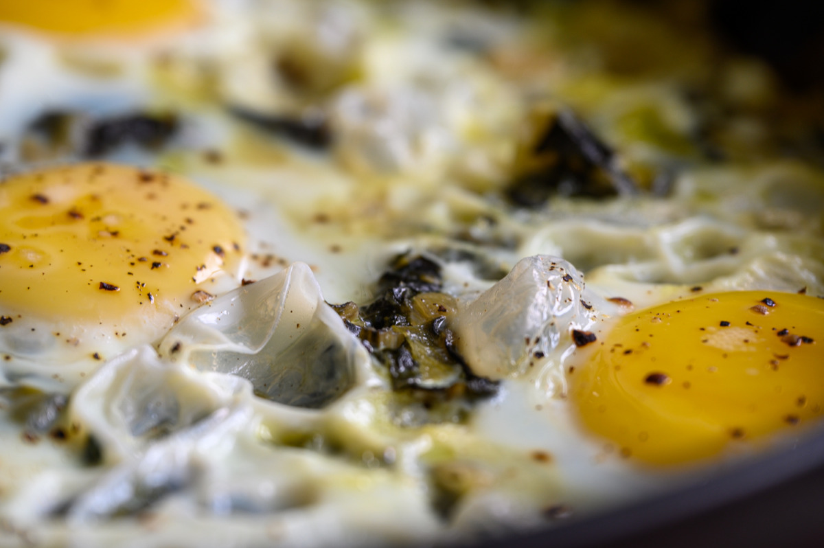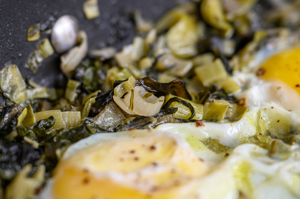2. אחרי שהתרכך, נוסיף רבע כוס שמן זית, כפית גרידת לימון, חצי כפית מלח ורבע כפית פלפל שחור. נערבב היטב ונצמצם נוזלים אם נשארו. ניצור גומות ובכל גומה נשתול ביצה. נמשיך לבשל. נכסה אבל נשים לב שהחלמונים הצהובים לא יהפכו קשים, אלא רק שיתבשלו. זה לוקח דקותיים. לשים לב. נפזר מעט מלח ופלפל שחור ונגיש.