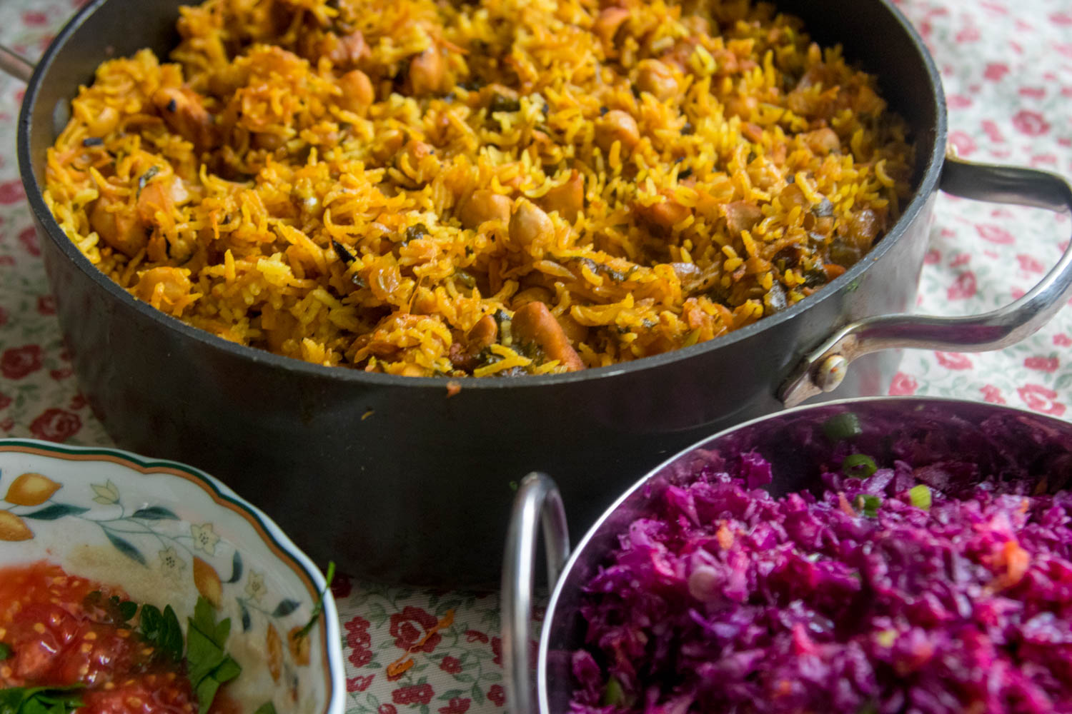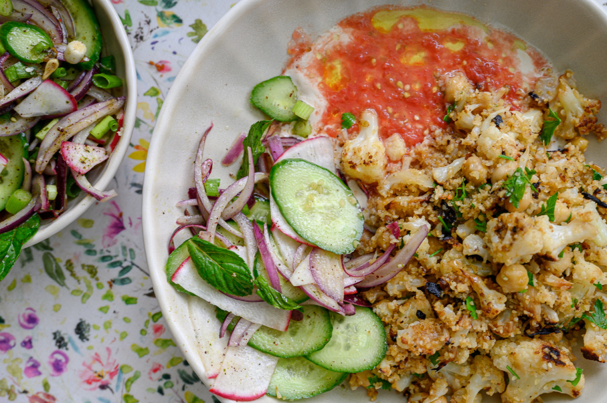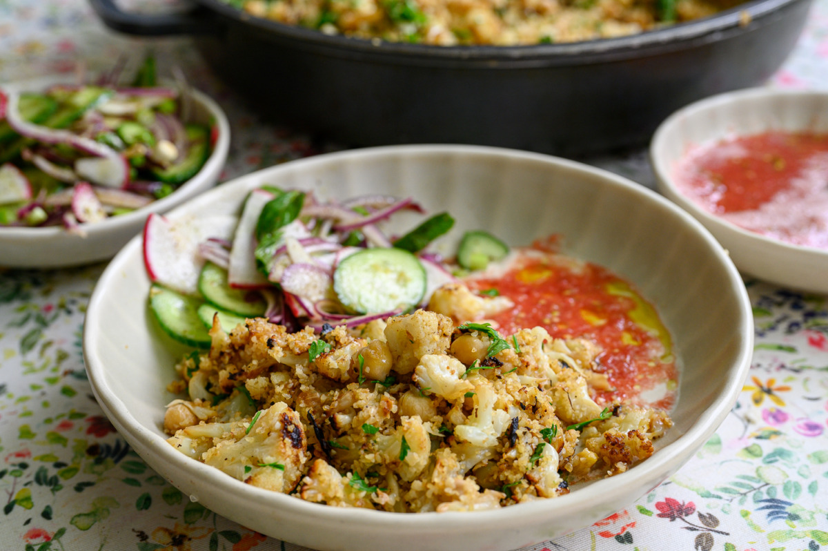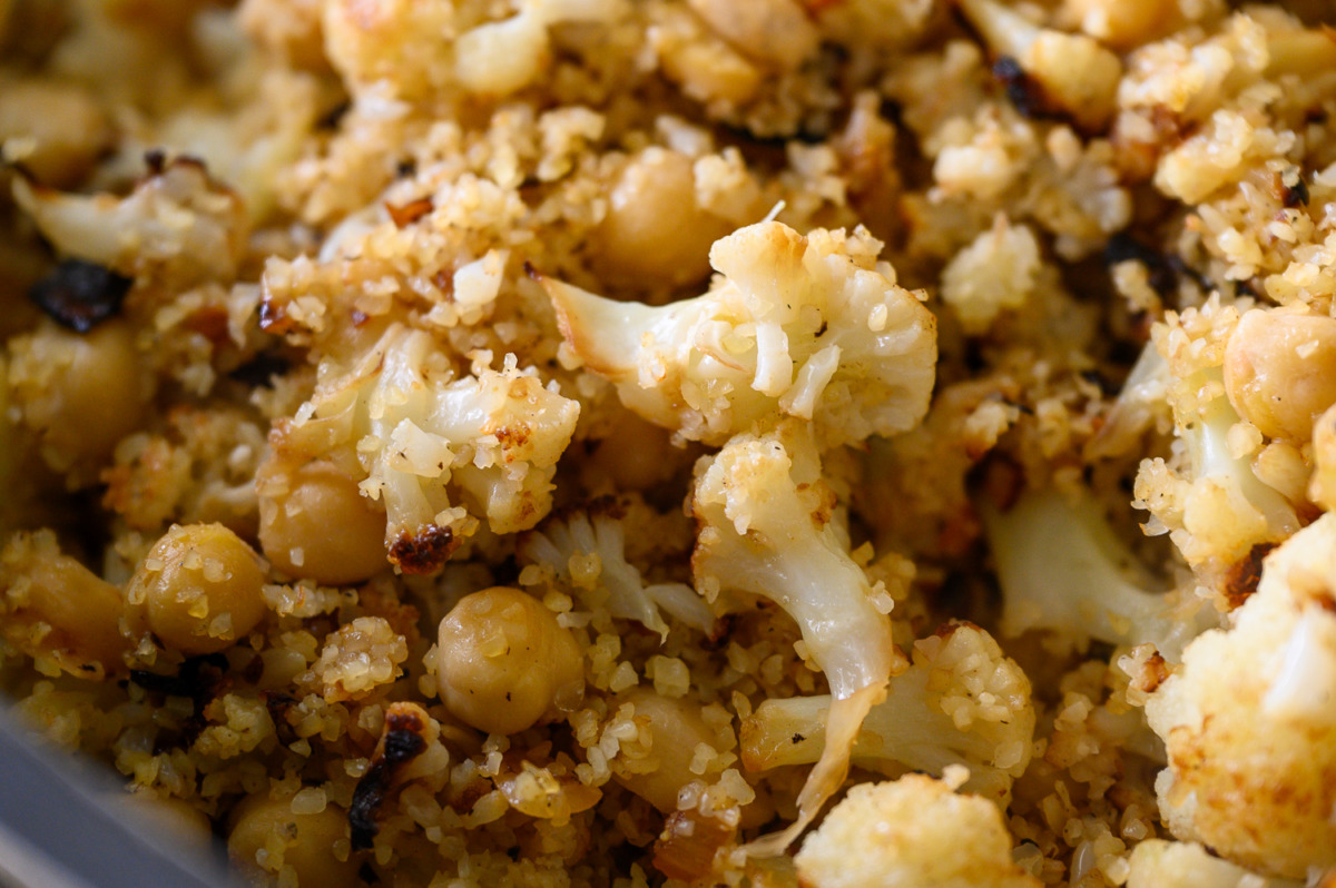 אני מאוד מחבבת את שיטת הבישול הזאת, מקפיצים ירקות על להבה גבוהה בסיר שטוח עם מכסה, האדים הכלואים מבשלים את הירקות וחום הכיריים נותן להם חריכה יפה. תוך 18 דקות בערך יש לנו תבשיל מהביל נפלא. יש בתבשיל את השילוש המג’דרי: בורגול עדשים ובצל. הוספתי כרובית שנתנה ככ הרבה טעם וחומוסים במקום העדשים. ככ נפלא וככ קל.