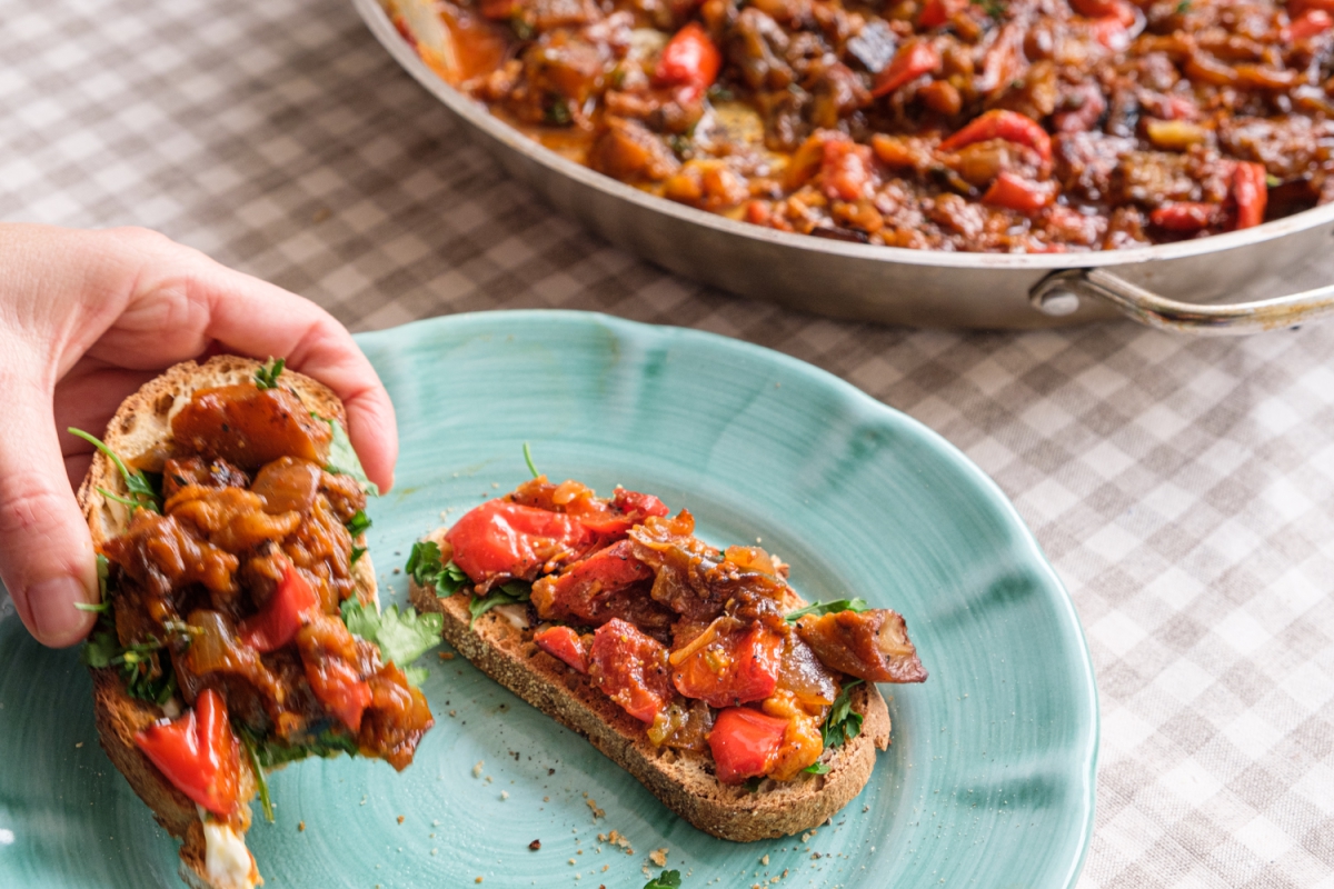 מה שחשוב לנו כאן, זה לחתוך את הבצל, החציל והפלפלים האדומים באותו גודל בדיוק. ואז התבשיל יוצא שיחוק. בדוק.