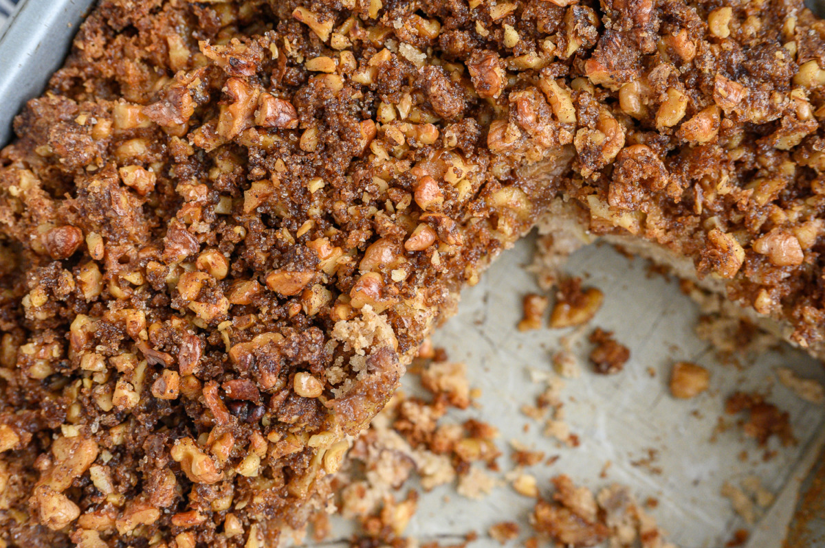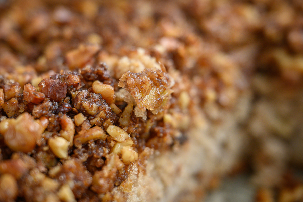 השטרוייזל: לאותה קערה מלוכלכת נכניס אגוזי מלך שקצצנו גס, סוכר לבן וחום כהה, כף קינמון, מלח ו4-5 כפות שמן נערבב ונפזר הכל מעל העוגה