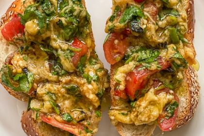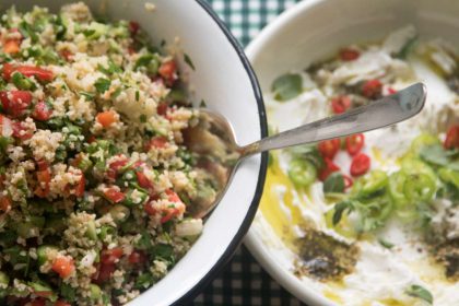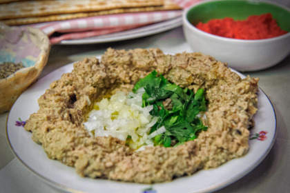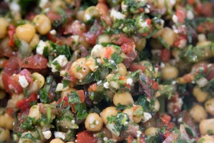 סלט עגבניות ודלעת צלויות, חומוסים ופטה