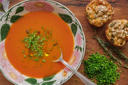 מרק עגבניות עם מאפינס יוגורט וירקות אפויים