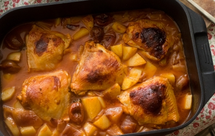 סיר של עוף עם תפוחי אדמה ומקרוני.